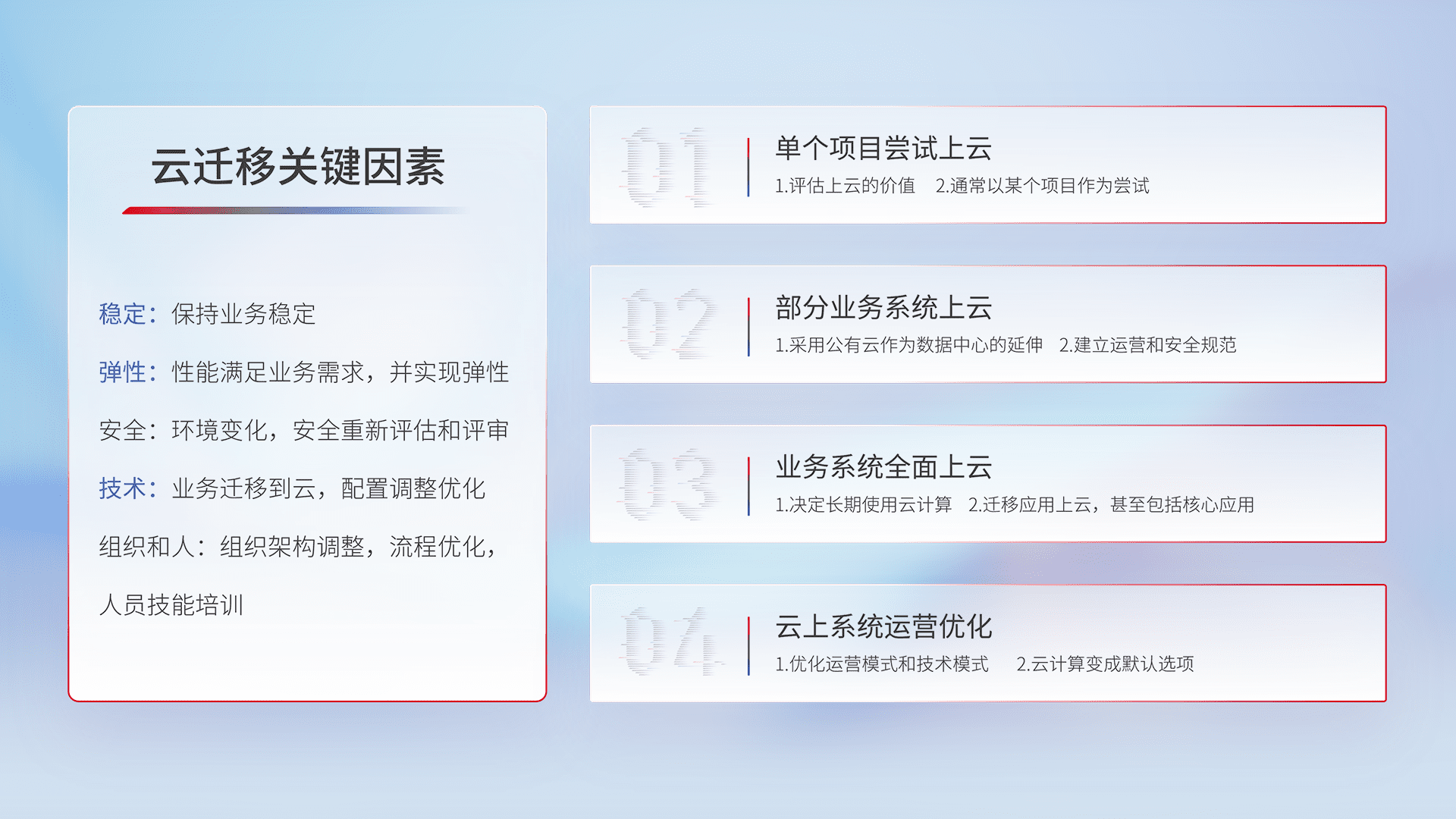 结合实际业务,,从规划设计、、、云平台选型、、、、云原生改造、、、、数据迁移、、、集成交付,,迁移全过程为客户识别最佳上云路径,,,,做好风险识别管理,,,设计网络架构、、身份权限、、、安全审计合规、、、、操作审计、、日志审计、、、监控告警策略、、多站点容灾设计等,,对云上基础设施进行整体规划,,,,提升IT治理水平,,,以满足弹性、、、高可用、、、高性能的需求。。。