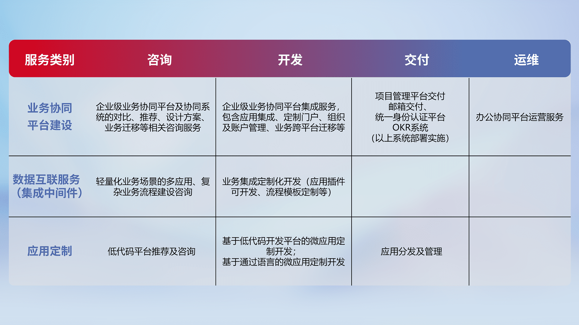 针对钉钉、、企微、、IDaas等平台级产品提供产品的规划、、方案、、交付、、、、定制化开发等服务,,,实现如统一协同办公、、智能客户服务、、、、混合会议管理、、、智能数据查询、、等业务场景,,,实现数字化转型。。。。